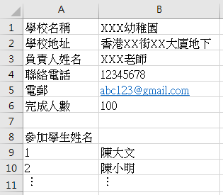 校方收集學生完成的小手冊後,請根據下圖的格式用Excel填寫學校資料及參加學生姓名,並於截止日期或之前把電子檔(.xls)電郵至waterconservation@wsd.gov.hk,即可報名參加活動。(完成的小手冊無需郵寄至水務署。)