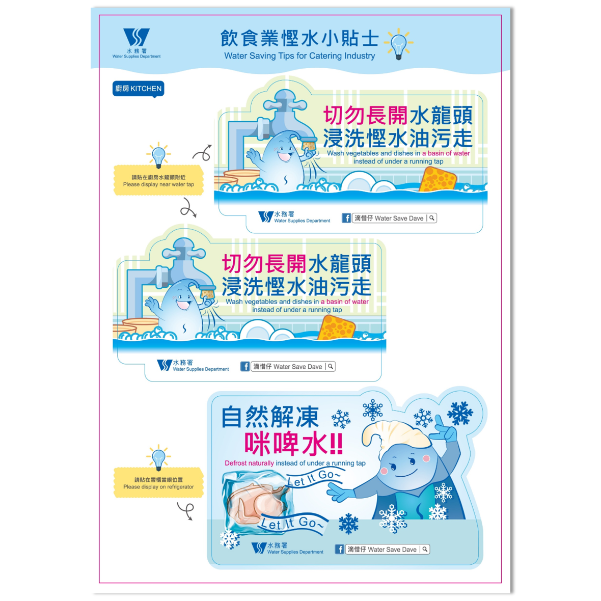 為提升飲食業的用水效益,我們製作了一系列節約用水貼紙,供餐廳張貼於各個當眼位置,提醒員工及顧客時刻節約用水。