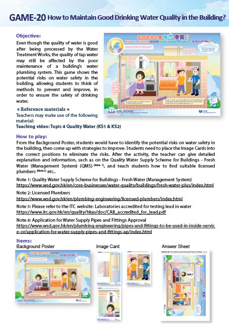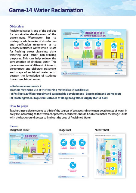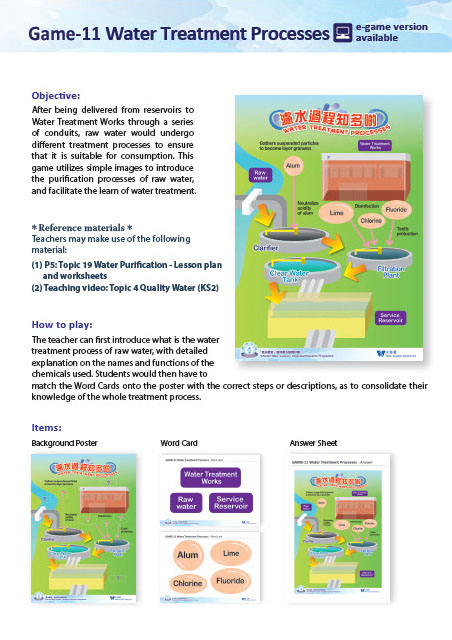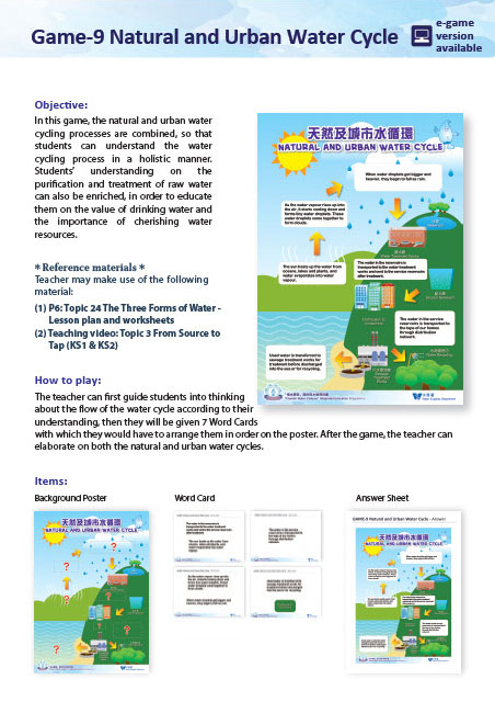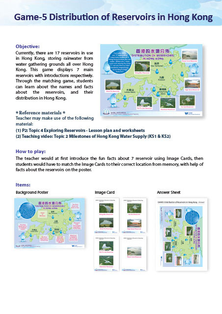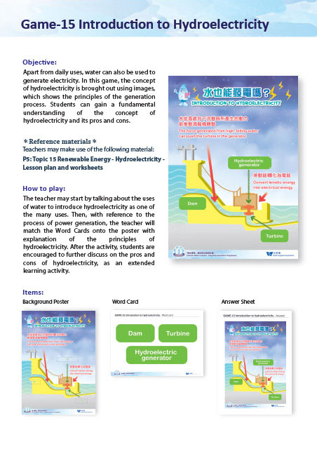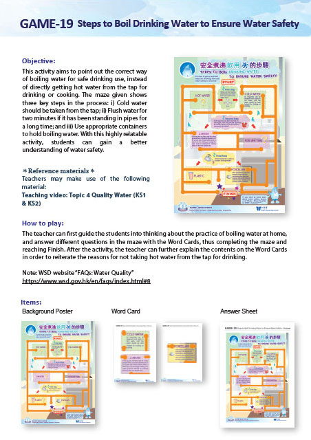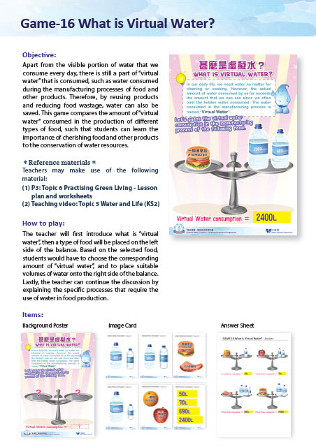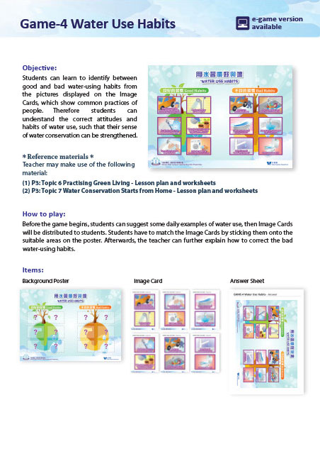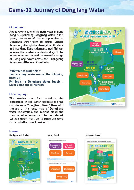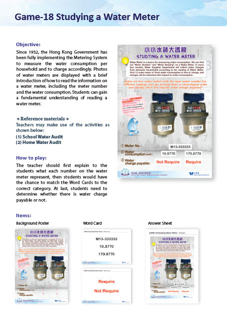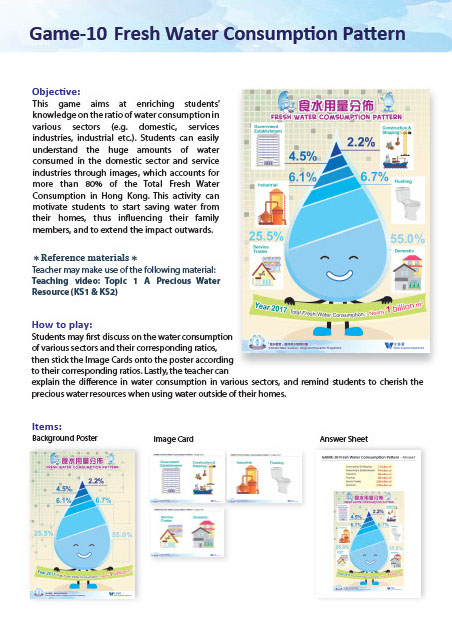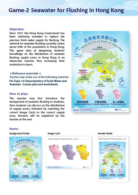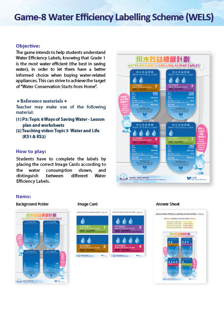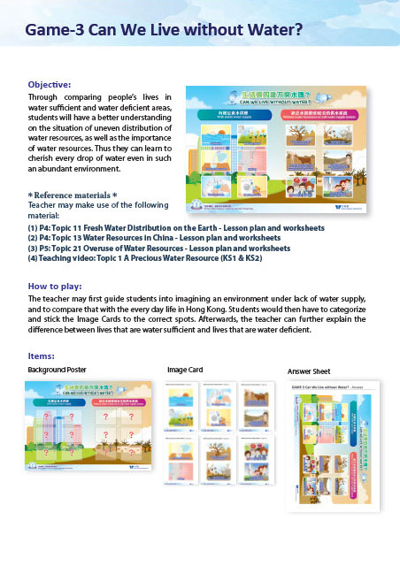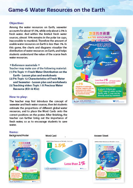 An Activities Kit* covers the topics related to water resources and water conservation. It is comprised of 20 mini-games and 3 computer games. It is hoped that the kit can increase the interaction between students and raise their learning interests.