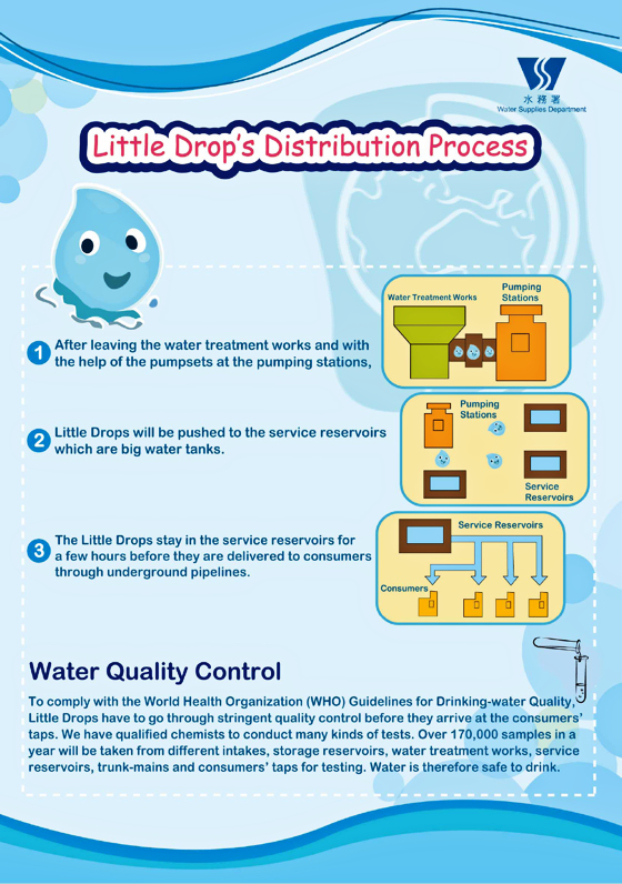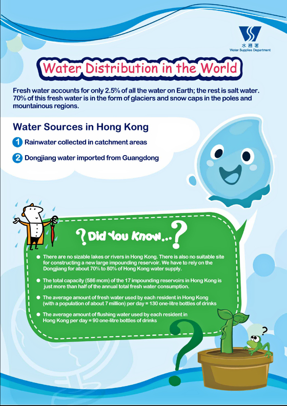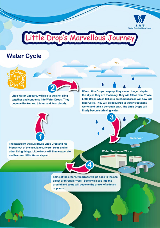 | Objectives and Content | The "Little Drop's Marvelous Journey" exhibition panel set is aimed to educate students that water is a scarce and important resource. Peoples should protect water resources and treasure every drop. The set introduces Hong Kong water sources, the water cycle, water treatment process and water distribution process. It also includes a warning against swimming in reservoirs. |