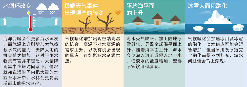 香港在风季期间不时受到持续暴雨和台风等恶劣天气威胁。在持续暴雨下,市区及乡郊地方(特别是低洼地带)会有水浸的风险。此外,与台风相关的强风及低气压,可引发海平面上升(称为「风暴潮」)和越过海堤的巨浪(称为「越堤浪」)。当台风吹袭时,一些沿海较低洼或当风的地点会有海水倒灌及淹浸的风险。随着气候变化,极端天气引起的威胁将越趋频繁和严重。
