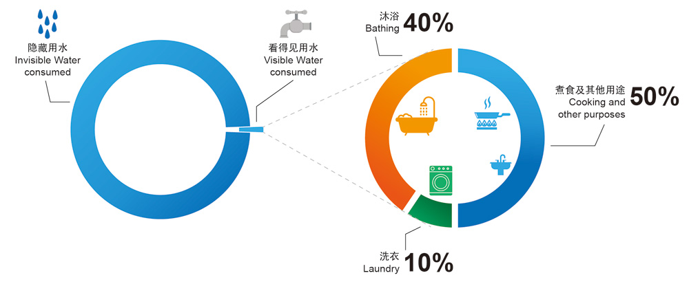 以香港为例,香港人每人每日平均耗用约150公升淡水,当中沐浴和洗衣分别占了约四成和一成用水量,其余五成则用作煮食和其他用途。事实上,这看得见的用水量只占我们日常消耗的总用水量的一少部份。因为背后还有大量大家或会忽略的隐藏用水来生产日常用品,当中更以食物为甚。