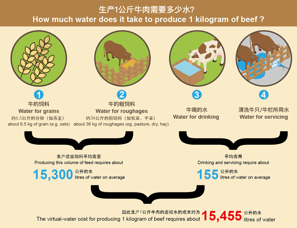 以牛肉作为例子,看看生产1公斤牛肉的耗水量: