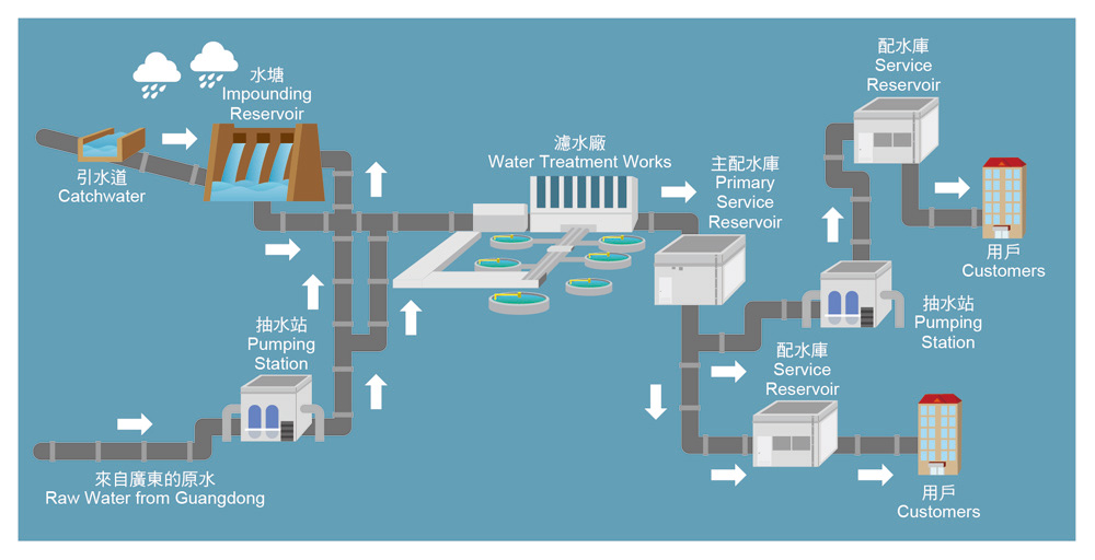 食水供应包括三个主要程序:收集原水、处理和分配。数千公里长的地下水管,组成纵横交错的输水网络供水到香港每一角落,当中包括多条横跨维多利亚港的海底管道。原水从水塘和东江经大型输水管及隧道送到滤水厂,过滤后再经输水干管或隧道抽送到配水库,继而利用水向低流原理,流进分配网络,输往不同建筑物包括住宅、商厦、酒店和餐厅、工厂和仓库等,最后抵达终点—用户的水龙头。