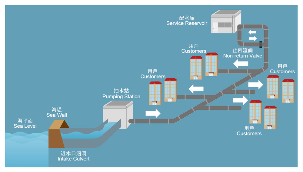 大部分海水抽水站都位于海堤边或附近,方便直接地把海水抽进冲厕水的分配网络。海水首先经过隔滤网,隔去秽土然后流进抽水站。抽水机设置于深层泵房内及装嵌在海平面下,一般以不锈钢制造。海水加入由电解氯气机所产生的次氧酸纳作消毒后,才加压抽送往用户。次氧酸纳所产生的余氯,亦可防止海产在配水管内生长。