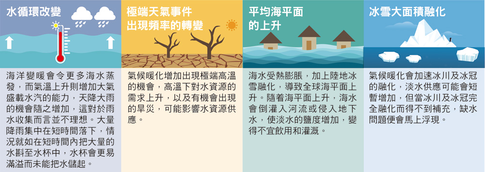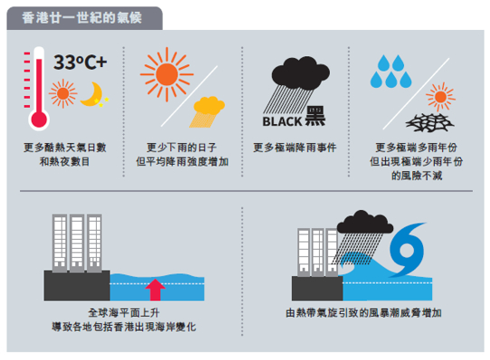 香港在風季期間不時受到持續暴雨和颱風等惡劣天氣威脅。在持續暴雨下,市區及鄉郊地方(特別是低窪地帶)會有水浸的風險。此外,與颱風相關的強風及低氣壓,可引發海平面上升(稱為「風暴潮」)和越過海堤的巨浪(稱為「越堤浪」)。當颱風吹襲時,一些沿海較低窪或當風的地點會有海水倒灌及淹浸的風險。隨着氣候變化,極端天氣引起的威脅將越趨頻繁和嚴重。