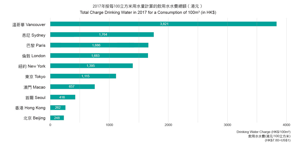 與世界其他主要城市相比,香港客戶為優質食水所繳付的費用相對低廉。除了1996年7月修訂的非本地船隻用水收費外,水費自1995年2月至今亦一直維持不變。