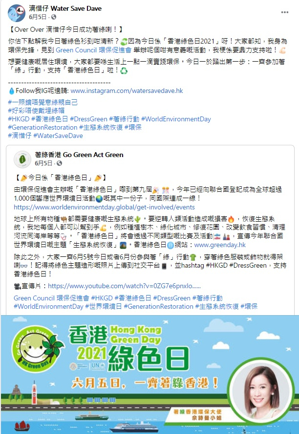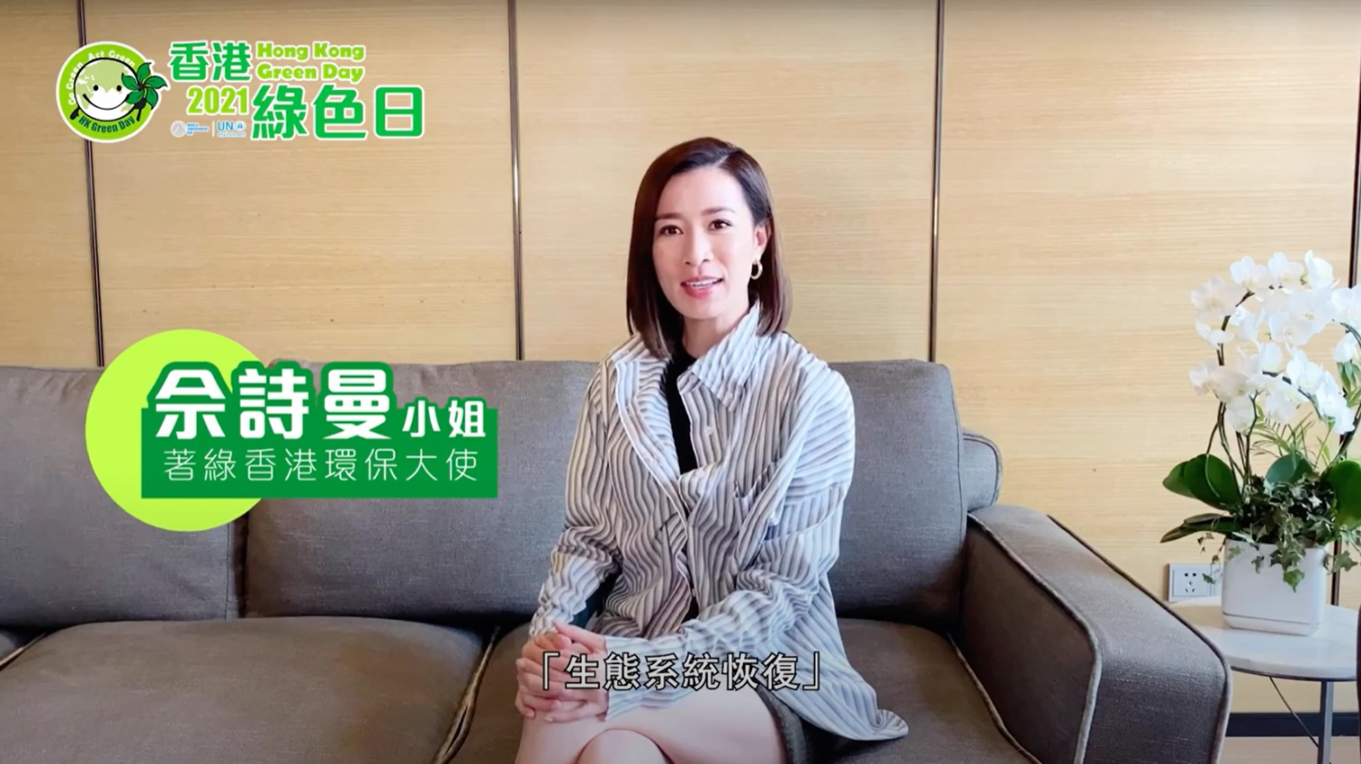 今年,佘詩曼小姐再次獲邀擔任「香港綠色日2021」的「著綠香港環保大使」,並以今年活動主題「生態系統恢復」拍攝數條短片,與公眾分享環保抗疫貼士。活動亦吸引逾80所企業加入「綠色承諾」行動,聯同約150間「綠色商店」及「綠色食肆」,共同承諾於辦公室及門市分店推行長期環保措施,並向顧客和合作夥伴推廣綠色生活。