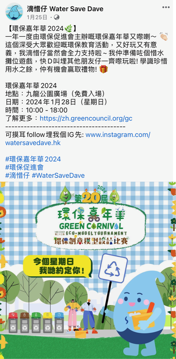 作為支持機構,水務署不但透過社交媒體宣傳活動,還於會場內設置攤位遊戲,更於眾多攤位中脫穎而出,獲得「最喜愛攤位佈置大獎」。